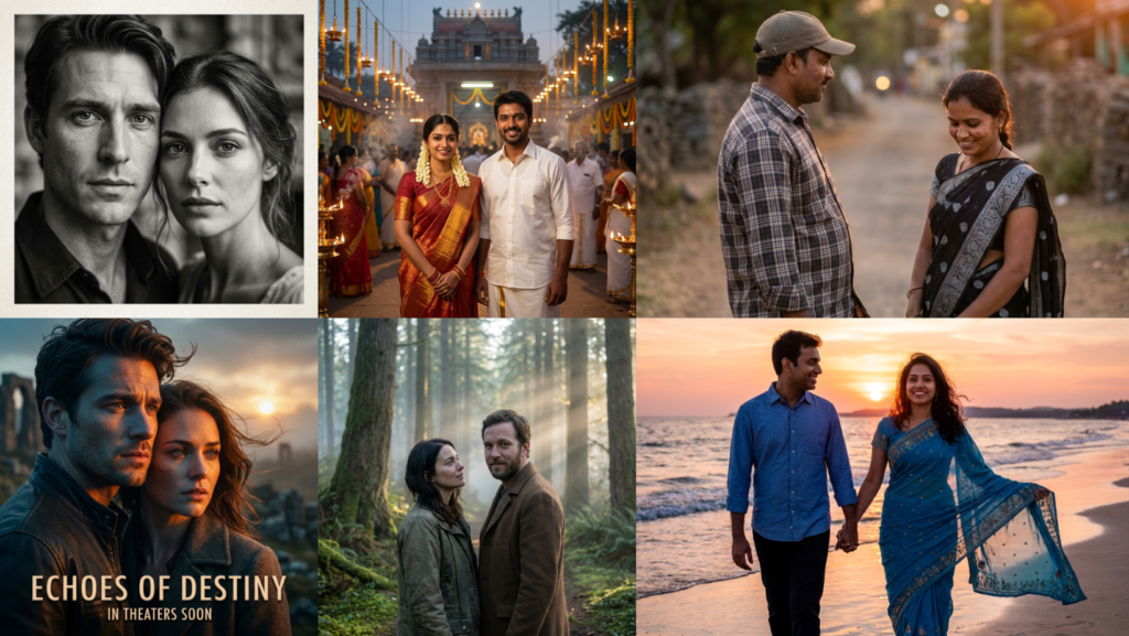The final result should look like a real movie poster shot using a cinema camera, ultra-realistic, extremely detailed, clear face, professional lighting, no AI look, no fake skin, no unrealistic editing.Take the uploaded couple photo and transform it into a large-scale cinematic movie poster scene. Keep both faces recognizable and realistic. Place the couple in the center with strong dramatic lighting, wind movement in clothes and hair, and a rich background with depth.