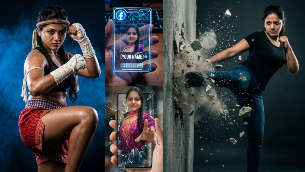 The Futuristic Facebook Acrylic ID Card and Breaking Through Smartphone Screen prompts are the best for viral-style edits.