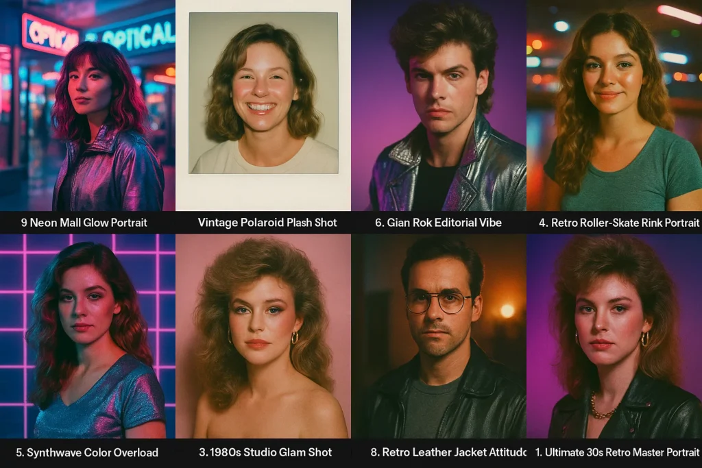 The retro 80s aesthetic is more than neon and grain — it’s attitude. It’s the era of chrome jackets, film cameras, mall photography studios, vaporwave colors, over-the-top fashion, and soft sunset glow. Recreating this mood in 2025 requires a careful balance of analog texture, film-like lighting, pastel-to-neon palettes, and storytelling. These 10 expertly built prompts capture the nostalgia of authentic 1980s portrait photography — from Polaroid-style framing to editorial glam studio looks. Every prompt here is designed for creators seeking bold, vibey, viral-ready 80s portraits with true DSLR-film realism.