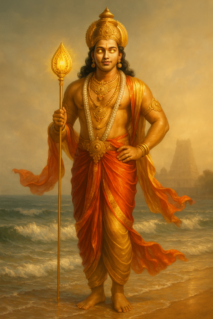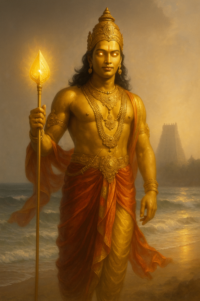 “Lord Murugan standing majestically near Thiruchendur seashore, traditional male deity form with bright golden skin tone, sharp eye glow, red–gold silk dhoti flowing in ocean breeze, vel shining with divine aura, background showing temple gopuram faintly behind rising mist, ocean waves reflecting sunlight, highly detailed ornaments, cinematic devotional lighting, 1080p HD mobile wallpaper.”