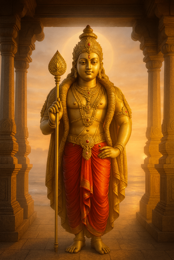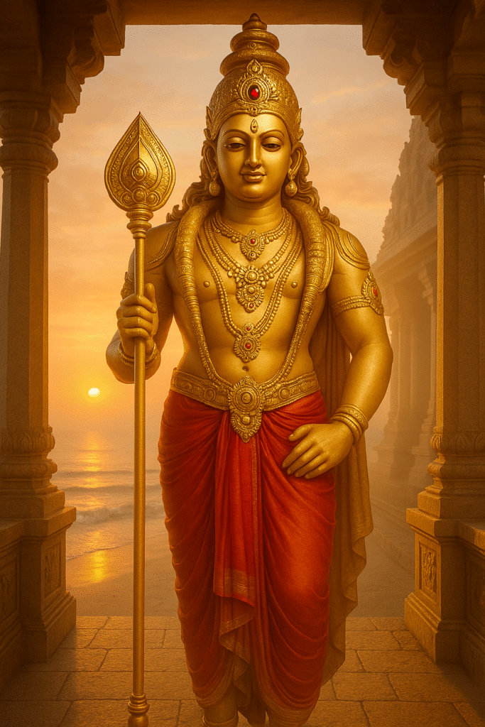 “Soft sunrise light illuminating Lord Murugan standing at Thiruchendur temple entrance, red silk dhoti, golden crown with ruby stones, vel held firmly, temple pillars glowing with morning rays, seawater reflecting orange skies, peaceful divine expression, ultra-sharp gold ornaments, misty ambient light, HD wallpaper clarity.”