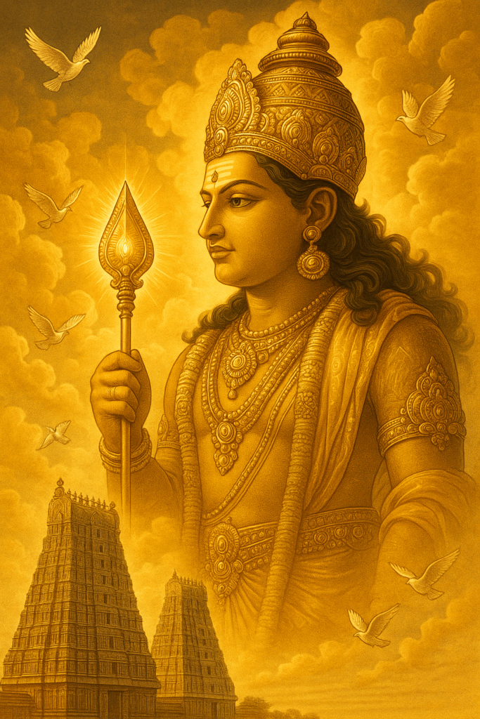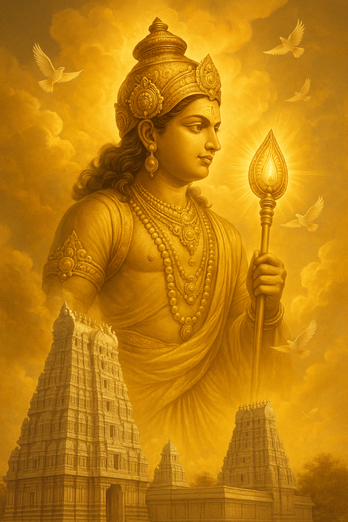 “Lord Murugan appearing above Thiruchendur temple towers, surrounded by golden clouds, vel radiating powerful aura, majestic male deity profile, gold ornaments and silk dhoti shining, holy birds flying across sky, ultra-detailed divine illustration, perfect for 4K wallpapers and devotional posters.”