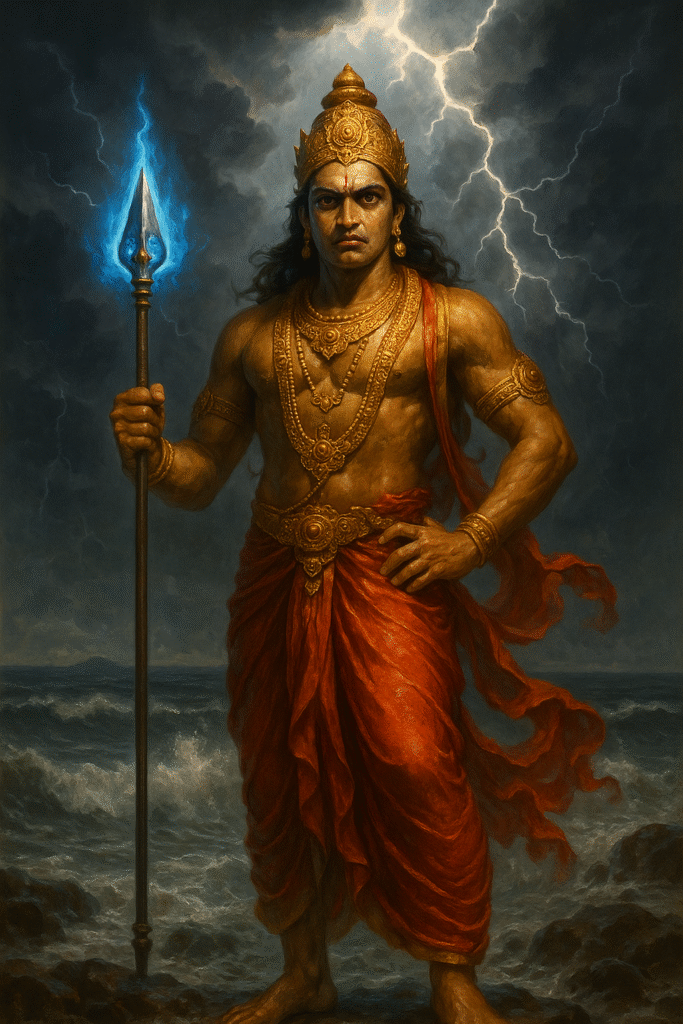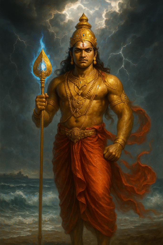 “Cinematic image of Lord Murugan standing boldly as storm clouds part above Thiruchendur waves, vel emitting divine blue flame, intense spiritual expression, golden ornaments catching lightning reflections, red flowing dhoti, dramatic atmosphere with sacred energy, ideal for vertical HD wallpapers.”