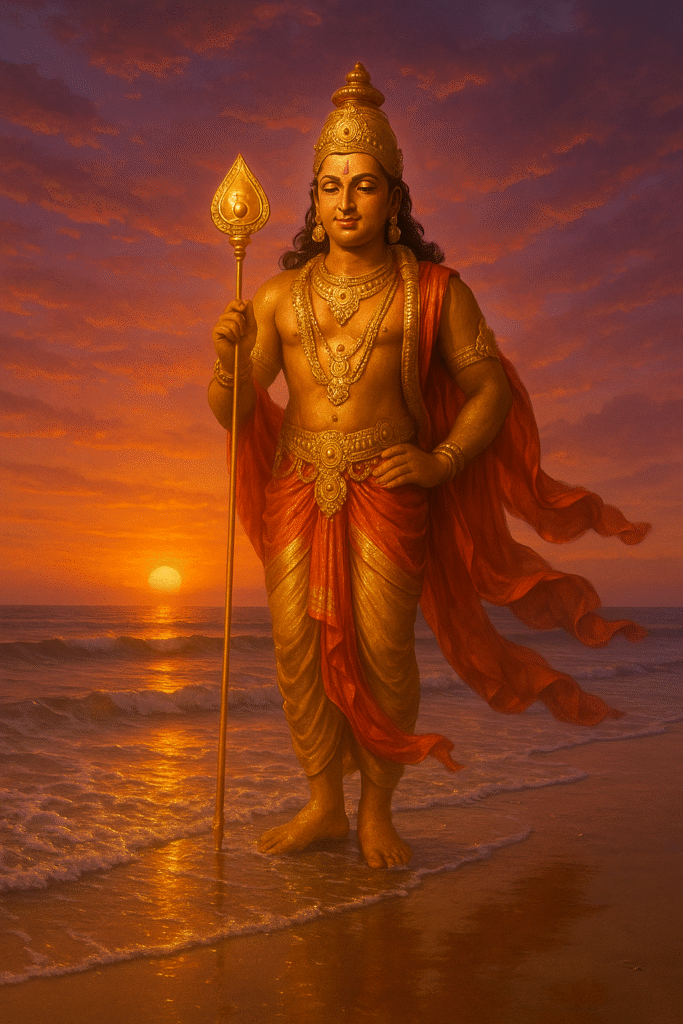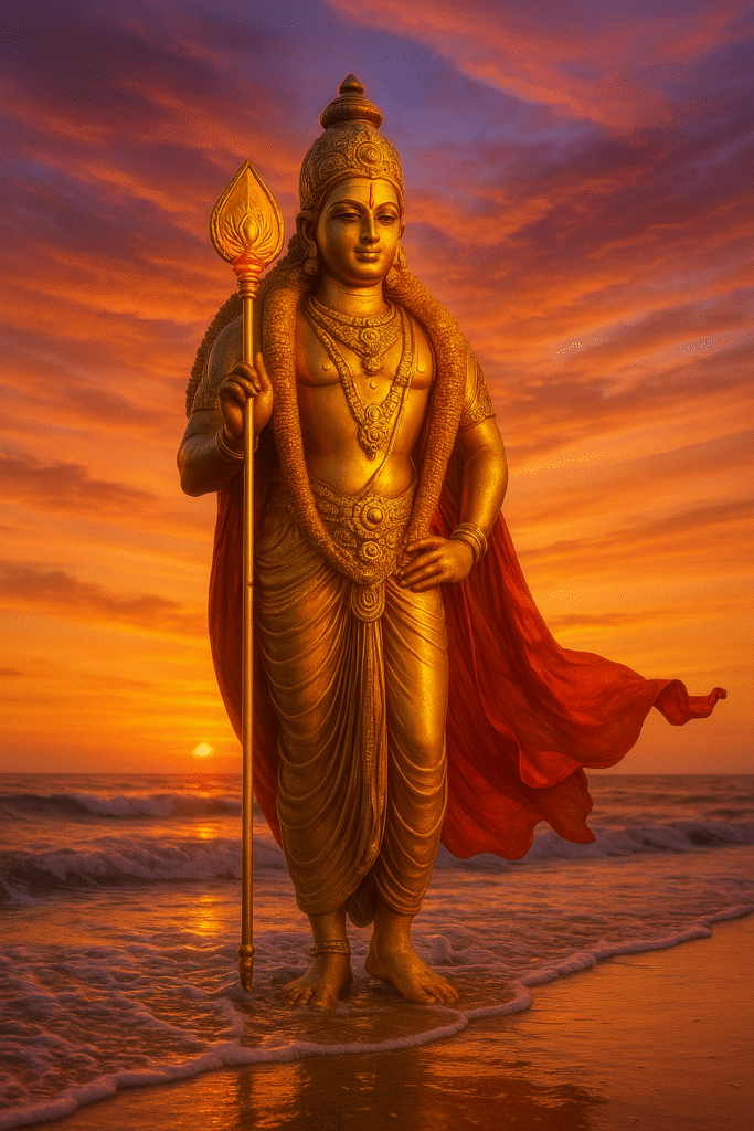 “Lord Murugan standing on wet seashore sand during sunset, orange and purple sky blending beautifully, vel reflecting sunset colors, gold ornaments glowing naturally, red silk cloth waving gently, waves washing around feet, serene divine expression, cinematic HD wallpaper perfect for mobile lockscreen.”