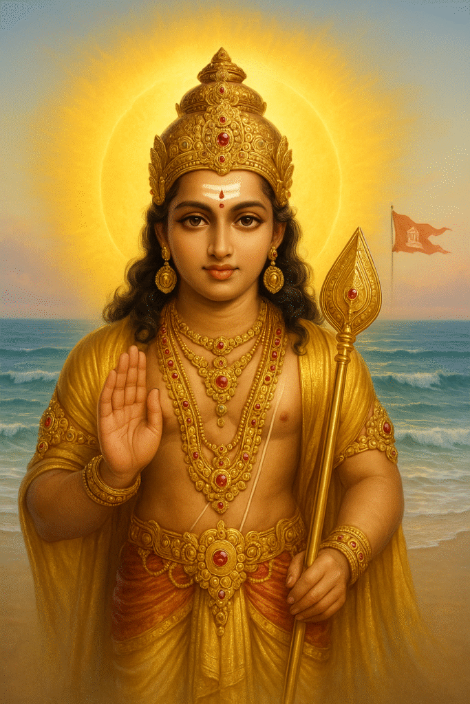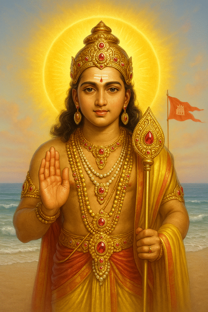 “Lord Murugan in blessing pose facing devotees, vibrant golden aura around body, precise ruby-studded jewelry, vel placed beside right arm, gentle beach waves in background, Thiruchendur temple flag fluttering, deep divine eyes, soft pastel sky gradient, high-clarity HD illustration with sacred atmosphere.”