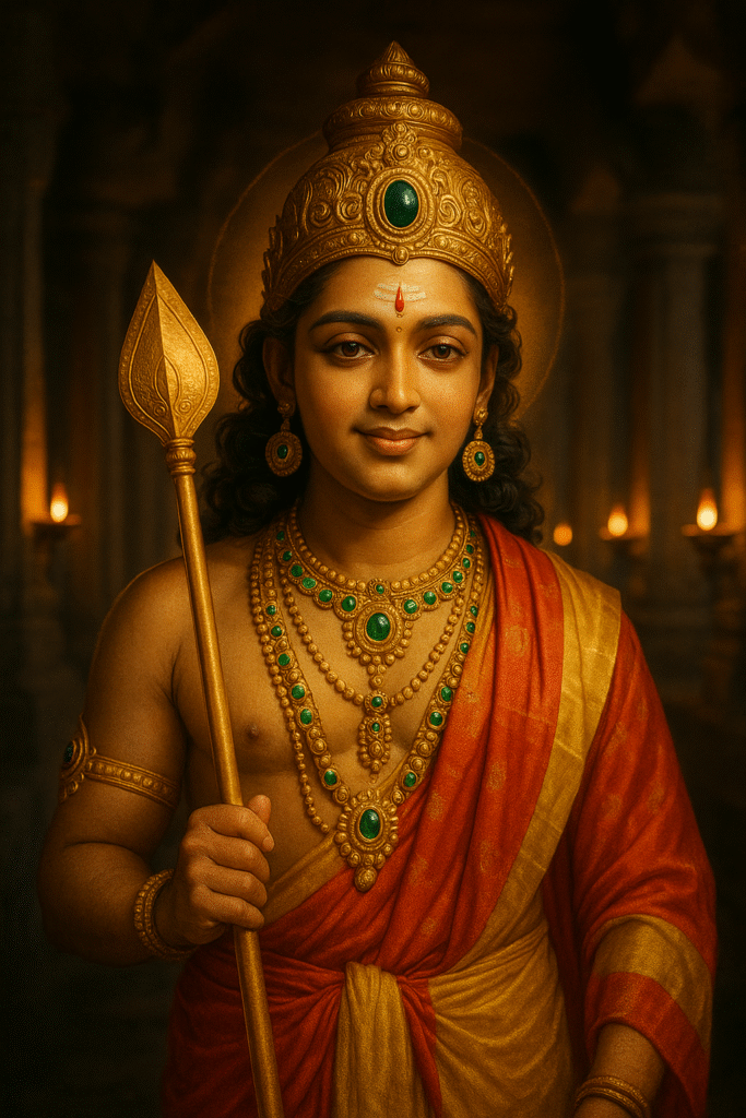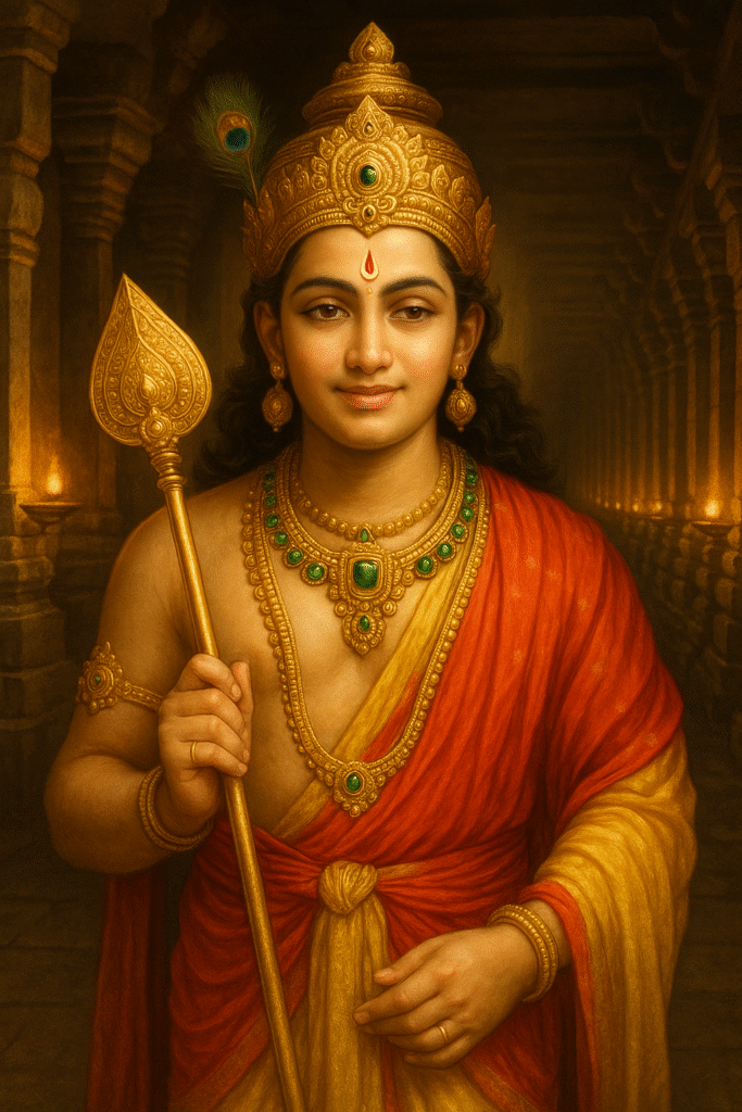 “Detailed close-up portrait of Lord Murugan inside Thiruchendur temple corridor, soft golden lamps illuminating stone pillars, Murugan wearing red–yellow dhoti, emerald-gold jewelry, vel resting on shoulder, gentle smile with divine glow, temple depth-of-field blur, 1080p devotional portrait.”