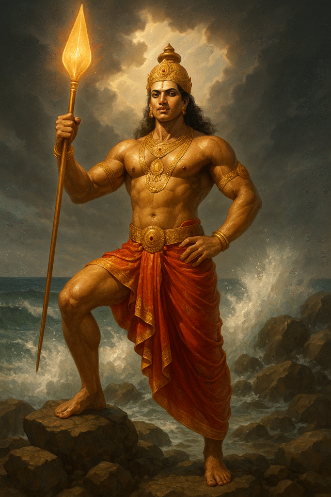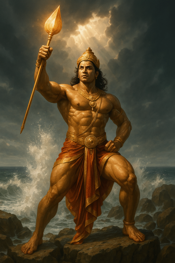 “Lord Murugan in warrior stance near Thiruchendur beach rocks, muscular divine male form, glowing vel raised high, golden chest ornaments shining, red-gold warrior silk dhoti, ocean splashing behind, dark clouds opening with divine rays, powerful cinematic lighting, dramatic devotional composition, 4K mobile wallpaper framing.”