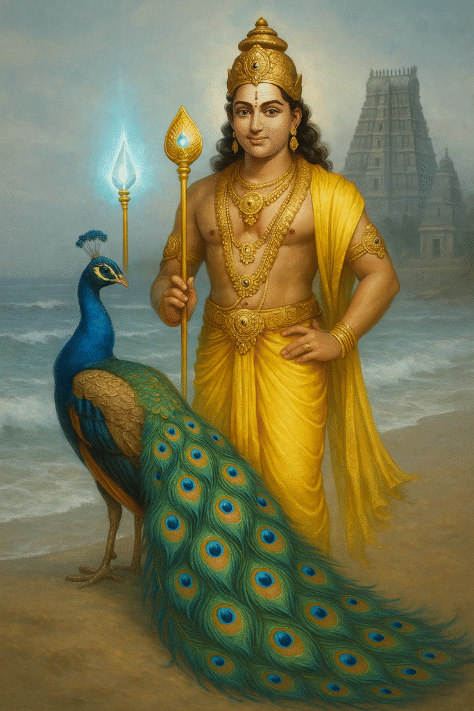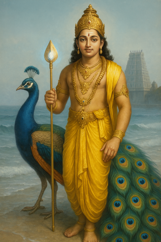 “Lord Murugan standing beside majestic peacock near Thiruchendur seashore, peacock feathers reflecting turquoise and gold, Murugan wearing bright yellow silk dhoti, heavy gold ornaments, vel glowing with blue-white aura, temple towers visible in background, realistic ocean mist, mobile wallpaper ratio.”