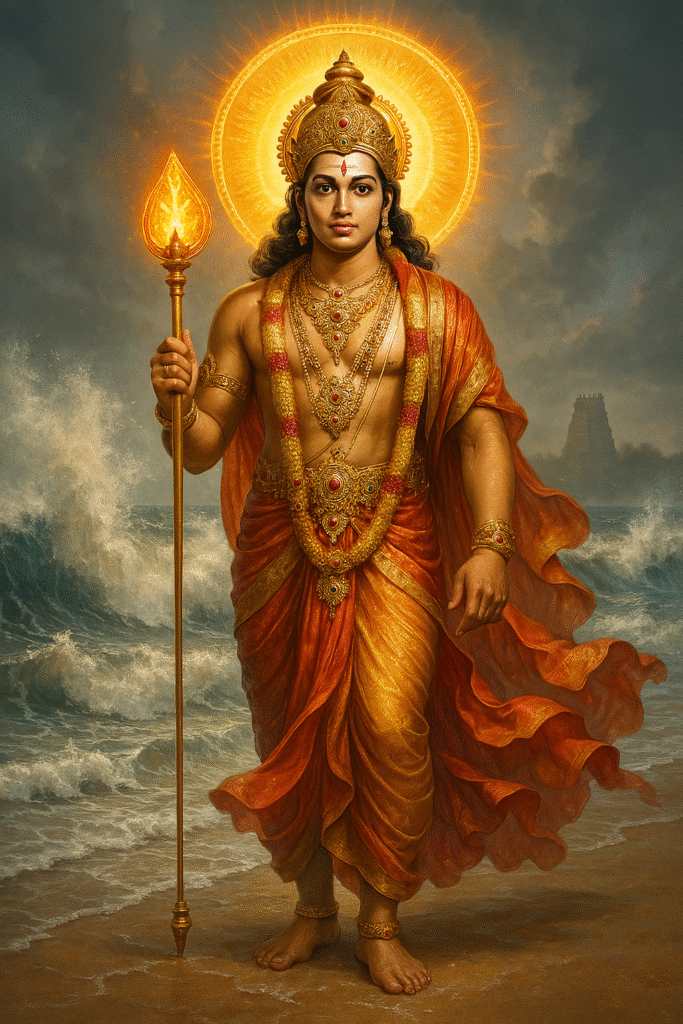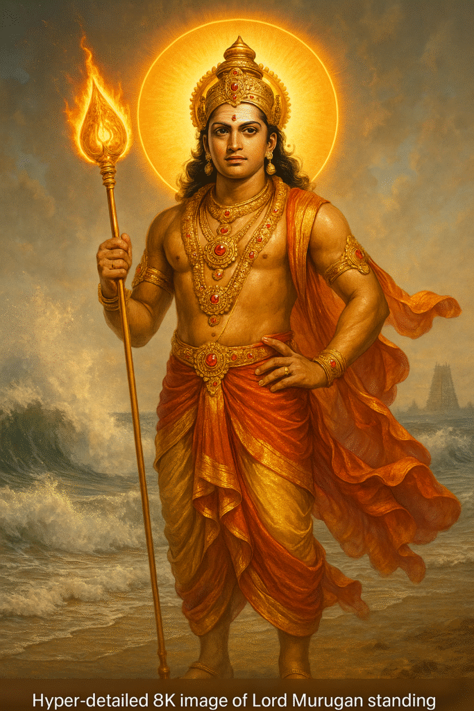 “Hyper-detailed 8K image of Lord Murugan standing on Thiruchendur seashore with waves crashing behind, bright golden halo, vel glowing like pure fire, red-gold silk dhoti fluttering dramatically, ruby-studded ornaments reflecting divine light, temple gopuram faintly visible in misty background, cinematic color grading, perfect 1080p framing for mobile and 4K poster-quality Murugan artwork.”