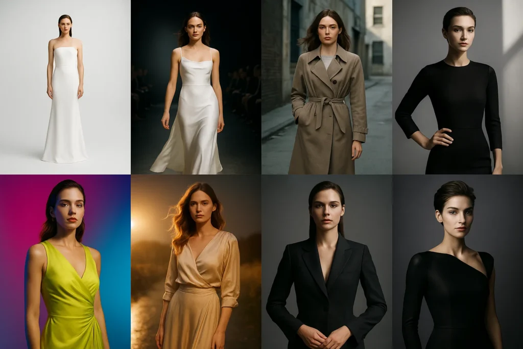 “Editorial 4K portrait of a fashion model on neutral grey background, balanced key + fill light setup, visible fine fabric weave, true-to-life shadows, shot on 85 mm f/1.8, ultra-realistic color profile”