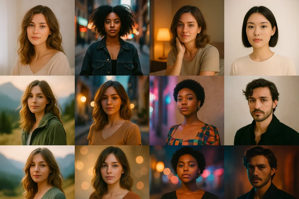 “8K cinematic portrait with completely random lighting mood (warm, cool, split-light, sunset, neon), random environment, dramatic emotional tone, perfect skin realism, precise eye sparkle, shallow depth, premium Instagram aesthetic, fully compatible with user-uploaded face or all-AI random portrait generation.”